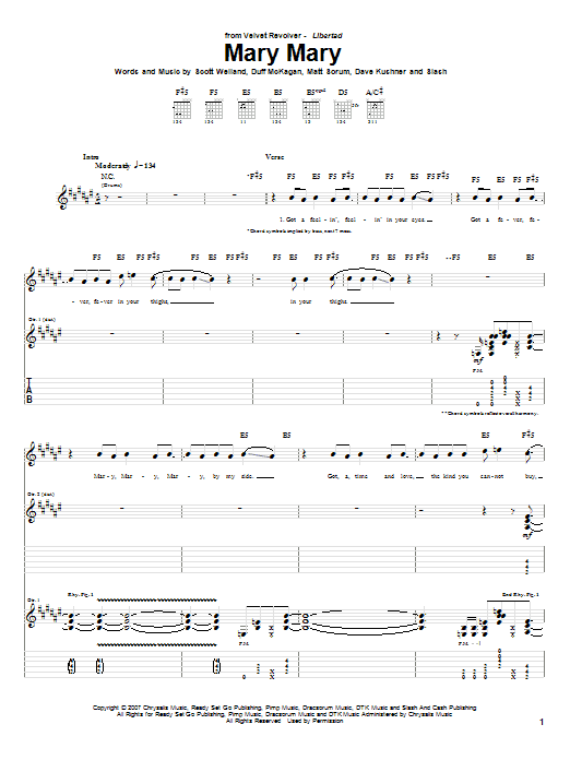 Velvet Revolver Mary Mary sheet music, chords, lyrics - Printable PDF for Guitar Tab